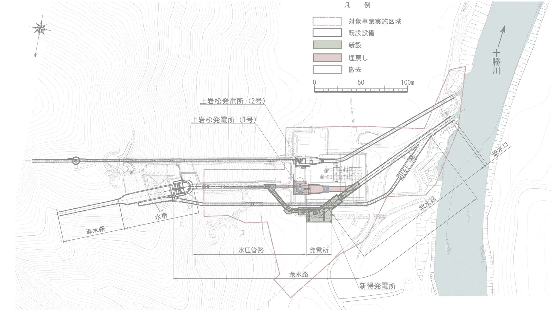 計画地点の周囲は保安林、送電敷地、道路敷地などに囲まれている。利用できるスペースは限られていることから、発電所の位置の決定や、水圧管路・放水路など水路設備のレイアウト策定に苦労し、プランは何度も変更を余儀なくされた。そして既存設備は流用するが、敷地内の現在とは別の位置に発電所を新設する方が経済性や優位性が高いと判断され、再開発計画としてプロジェクトはスタートを切った。