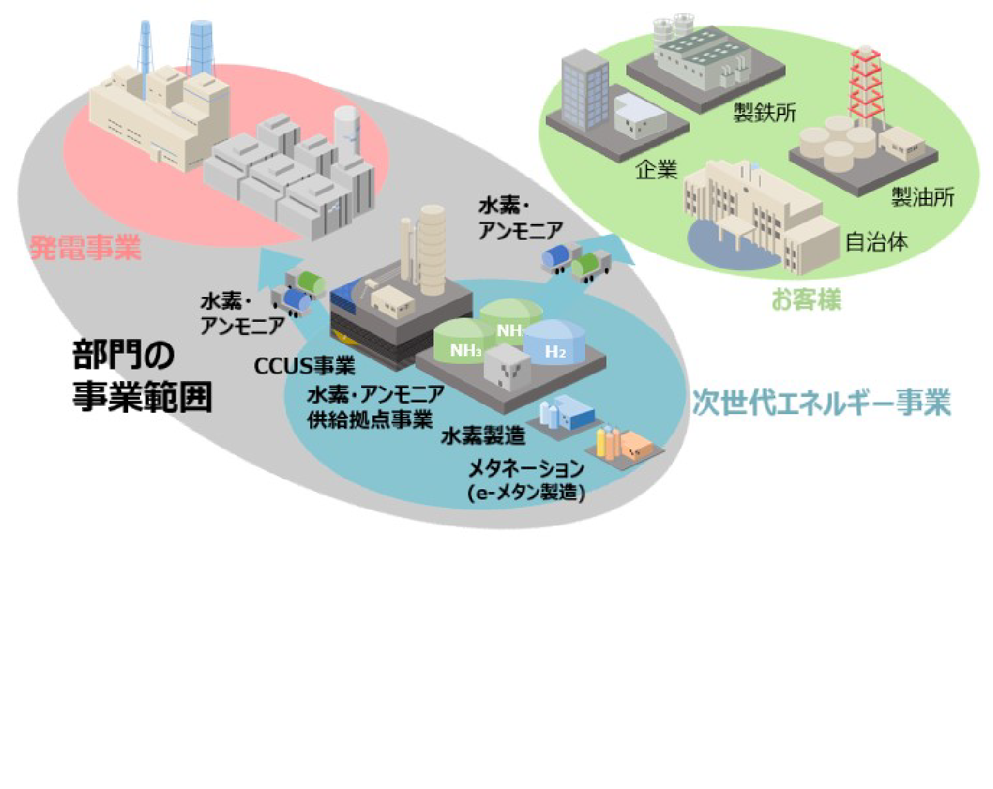 次世代エネルギー部は従来の火力発電事業を基盤としつつ、脱炭素エネルギー供給の担い手として、水素・アンモニア等の調達・製造・供給に関する取組みや、カーボンニュートラル化火力発電事業の実現に向けた検討を進めています。