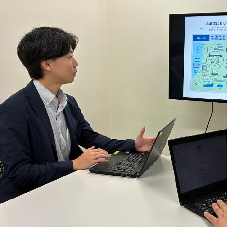 現在の職場では発電所で使用する燃料を水素へ転換するだけではなく、製造した水素と発電所で発生したCO₂から非電力エネルギーである合成燃料eメタンを生み出す挑戦にも関わっています。この中で、私は水素関連の各種検討に携わっており、社外の方々とも議論しながら新しいエネルギーの未来を切り拓くことも、大きなやりがいです。